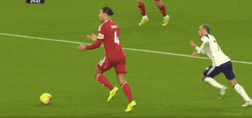 第30分鐘,西蒙斯背后出腳,踩在了范迪克的跟腱上,順勢又將自己的荷蘭國家隊隊友放倒,裁判立即向西蒙斯出示黃牌。